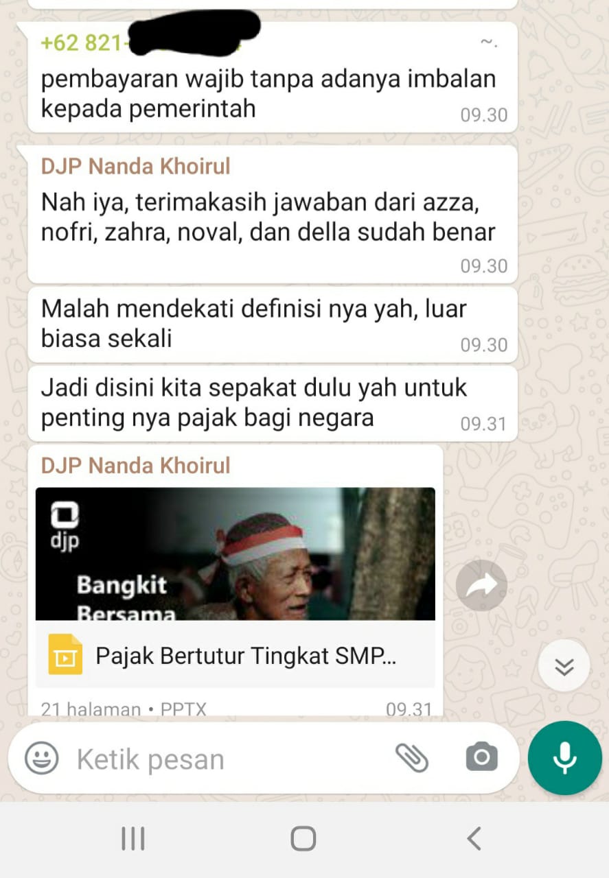 Kantor Pelayanan, Penyuluhan, dan Konsultasi Perpajakan (KP2KP) Paringin melaksanakan kegiatan Tax Goes To School (TGTS) secara virtual melalui media WhatsApp bersama dengan SMPN 1 Paringin, Kabupaten Balangan, Kalimantan Selatan (Kamis, 24/9).