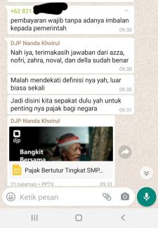 Kegiatan TGTS melalui WhatsApp ini direspons positif oleh para peserta. Terbukti dari antusias para peserta menjawab pertanyaan-pertanyaan yang diberikan. Tidak lupa, materi kesadaran pajak dan penanaman pemahaman bahwa membayar pajak merupakan salah satu bentuk berbagi kepada sesama juga disematkan dalam kegiatan tersebut.