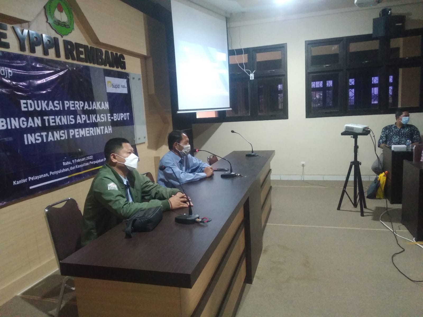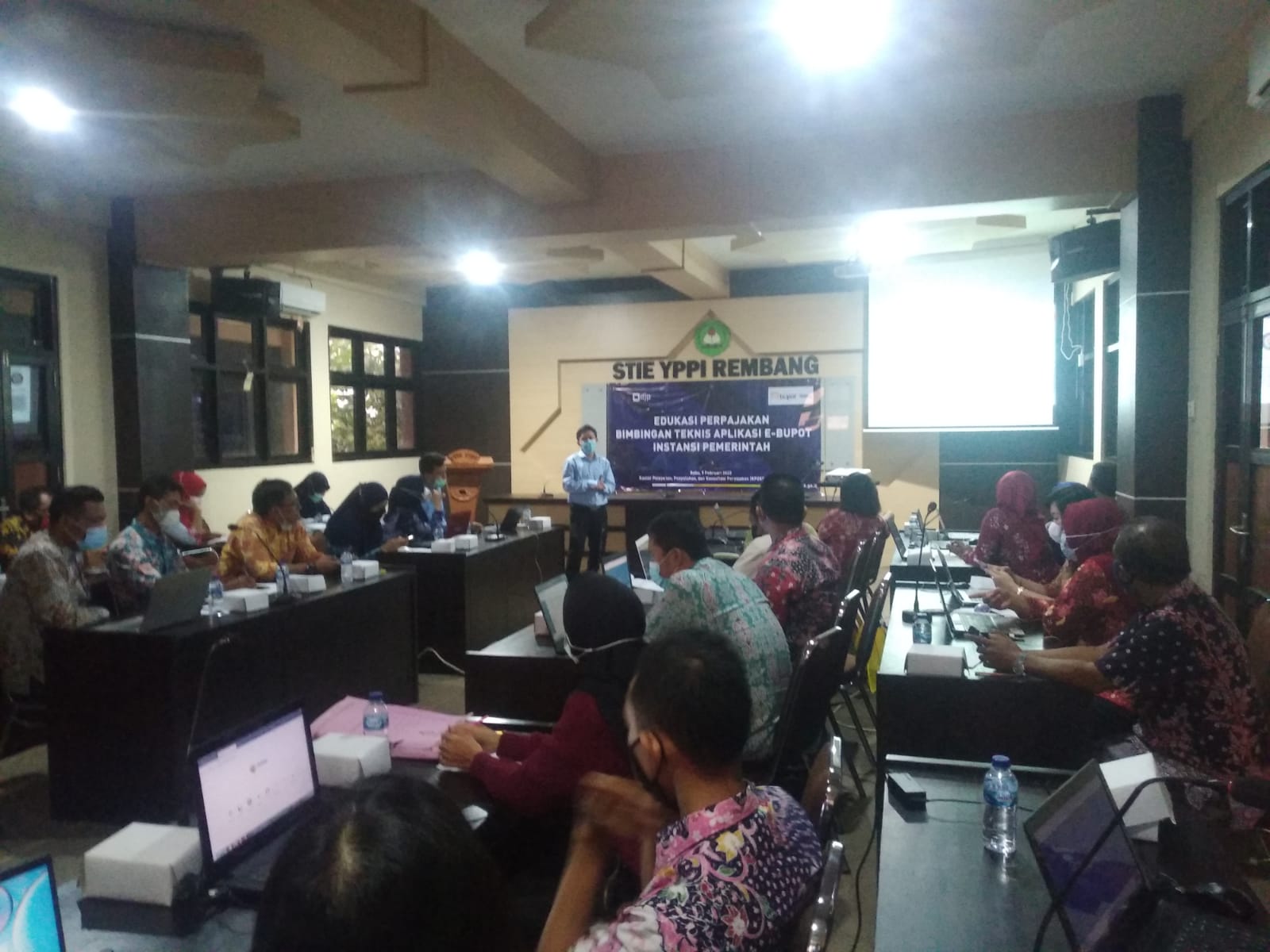 Kantor Pelayanan, Penyuluhan, dan Konsultasi Perpajakan (KP2KP) Rembang bersama Kantor Pelayanan Pajak (KPP) Pratama Pati bekerja sama dengan Sekolah Tinggi Ilmu Ekonomi Yayasan Pengembang Potensi Islami (STIE YPPI) Rembang melaksanakan Edukasi Perpajakan bimbingan teknis Aplikasi e-Bupot Instansi Pemerintah (IP) dalam pembuatan Bukti Pemotongan Pajak Penghasilan (PPh) Pasal 21 secara tatap muka di ruang sidang lantai 2 Kampus STIE YPPI Rembang, Rembang, Jawa Tengah (Rabu, 9/2).