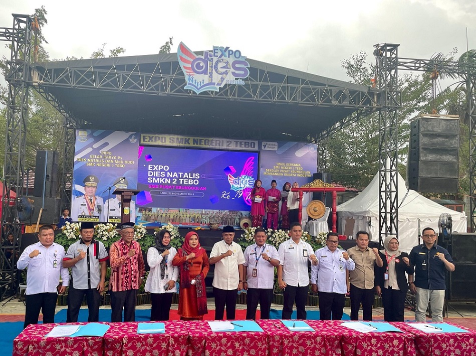 Kepala Kantor Pelayanan, Penyuluhan, dan Konsultasi Perpajakan (KP2KP) Rimbo Bujang Yosep Erdy Nugraha memenuhi undangan dari SMK Negeri (SMKN) 2 Tebo untuk menghadiri kegiatan Expo, Dies Natalis, dan MoU dengan pelaku Dunia Usaha dan Dunia Industri (DUDI) SMKN 2 Tebo (Rabu, 22/11). Kegiatan yang berlangsung sejak pukul 08.00 WIB ini digelar di lapangan SMKN 2 Tebo, Kabupaten Tebo.