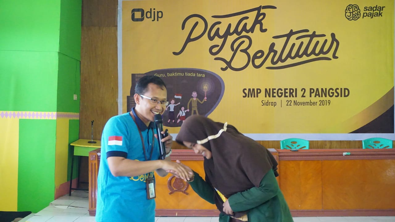 Kantor Pelayanan, Penyuluhan, dan Kosultasi Perpajakan (KP2KP) Sidrap turut menyemarakkan program Inklusi Pajak dengan menggelar kegiatan Pajak Bertutur yang dilaksanakan di SMP Negeri 2 Pangsid (Jumat, 22/11). Para siswa pun tampak antusias mengikuti rangkaian acara yang bertemakan “Guru, Baktimu Tiada Tara” tersebut.