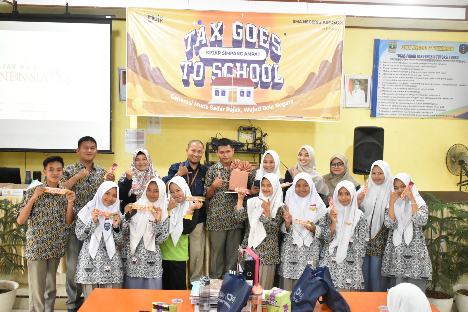 Ucapan terima kasih disampaikan kepada guru dan siswa SMA Negeri 2 Pasaman atas partisipasi mereka dalam kelancaran kegiatan Tax Goes To School 2024. Kegiatan ini bertujuan memperkenalkan kepada generasi muda pentingnya pajak dan manfaatnya bagi kelangsungan bangsa Indonesia.