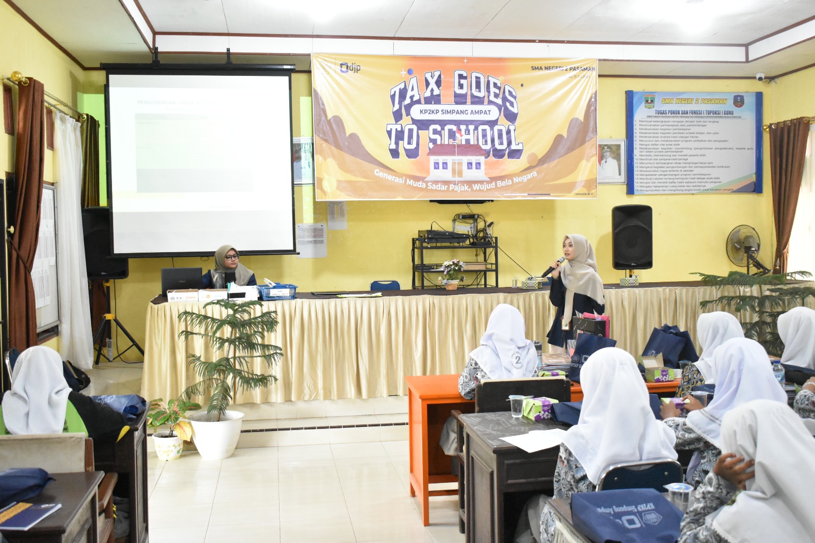 Kantor Penyuluhan, Pelayanan, dan Konsultasi Perpajakan (KP2KP) Simpang Ampat mengadakan kegiatan Tax Goes To School (TGTS) di SMA Negeri 2 Pasaman, Pasaman Barat, Sumatera Barat (Rabu, 31/7). Kegiatan ini mengusung tema "Sadar Pajak Bukti Peduli Pada Negeri."
