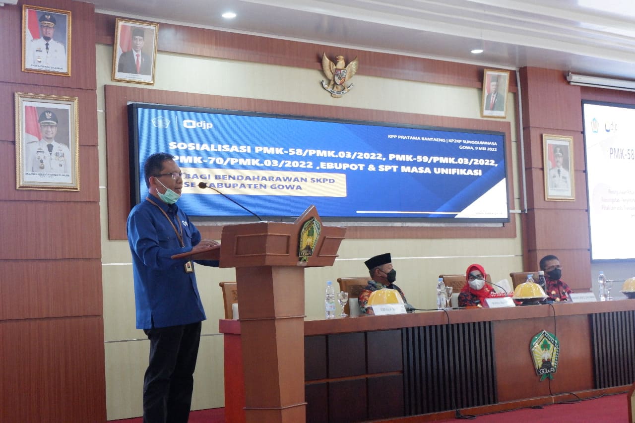 Kantor Pelayanan, Penyuluhan, dan Konsultasi Perpajakan (KP2KP) Sungguminasa bersama Kantor Pelayanan Pajak (KPP) Pratama Bantaeng menyelenggarakan kegiatan Sosialisasi PMK-58/PMK.03/2022, PMK-59/PMK.03/2022, PMK-70/PMK.03/2022, e-Bupot dan SPT Unifikasi bagi Bendahara Satuan Kerja Perangkat Daerah (SKPD) Se-Kabupaten Gowa (Kamis, 9/6). Kegiatan ini digelar secara tatap muka di Baruga Karaeng Galesong, Kantor Bupati Kabupaten Gowa.