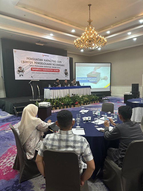Kantor Pelayanan, Penyuluhan, dan Konsultasi Perpajakan (KP2KP) Sungguminasa menghadiri undangan Badan Pengawas Pemilihan Umum (Bawaslu) Kabupaten Gowa sebagai narasumber terkait kegiatan Penguatan Kapasitas SDM yakni Bimbingan Teknis Pengelolaan Keuangan yang dilaksanakan dalam rangka penyeragaman dan percepatan pelaksanaan program kerja dan pengelolaan keuangan pada pemilihan Kepala Daerah Tahun 2024, di Hotel Aryaduta Makassar (Jumat, 30/8).