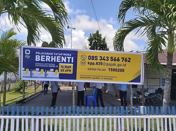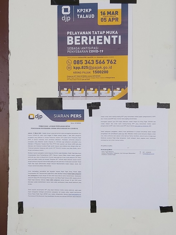 Berdasarkan Surat Edaran Direktorat Jenderal Pajak Nomor SE-13/PJ/2020 tentang Panduan Pelaksanaan Tugas Selama Masa Pencegahan Penyebaran Corona Virus Disease (COVID-19), KP2KP Talaud untuk sementara menutup pelayanan pojok pajak di Pulau Salibabu tepatnya di Kantor Lurah Lirung I (Selasa, 17/3). Penutupan pelayanan pojok pajak dikoordinasikan oleh Pegawai KP2KP Talaud Achmad Rizky Topaziano dengan Lurah Lirung Ismael Tingginehe.