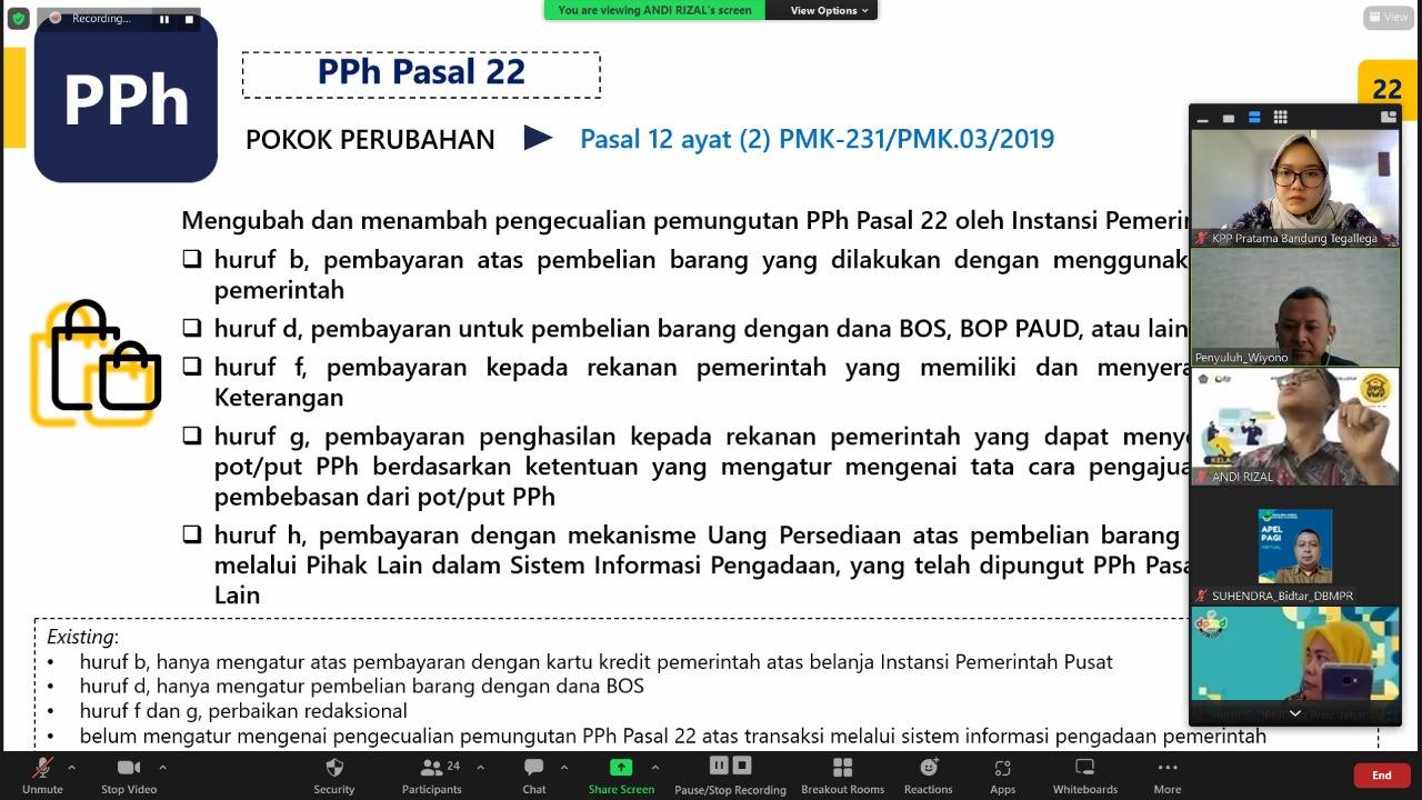 Kegiatan yang secara daring melalui aplikasi zoom meeting ini diikuti 25 wajib pajak dari berbagai instansi pemerintah dan dipandu oleh Tim Penyuluh Pajak KPP Pratama Bandung Tegallega yaitu Andi Rizal, Wiyono serta Dita Vega Amelia