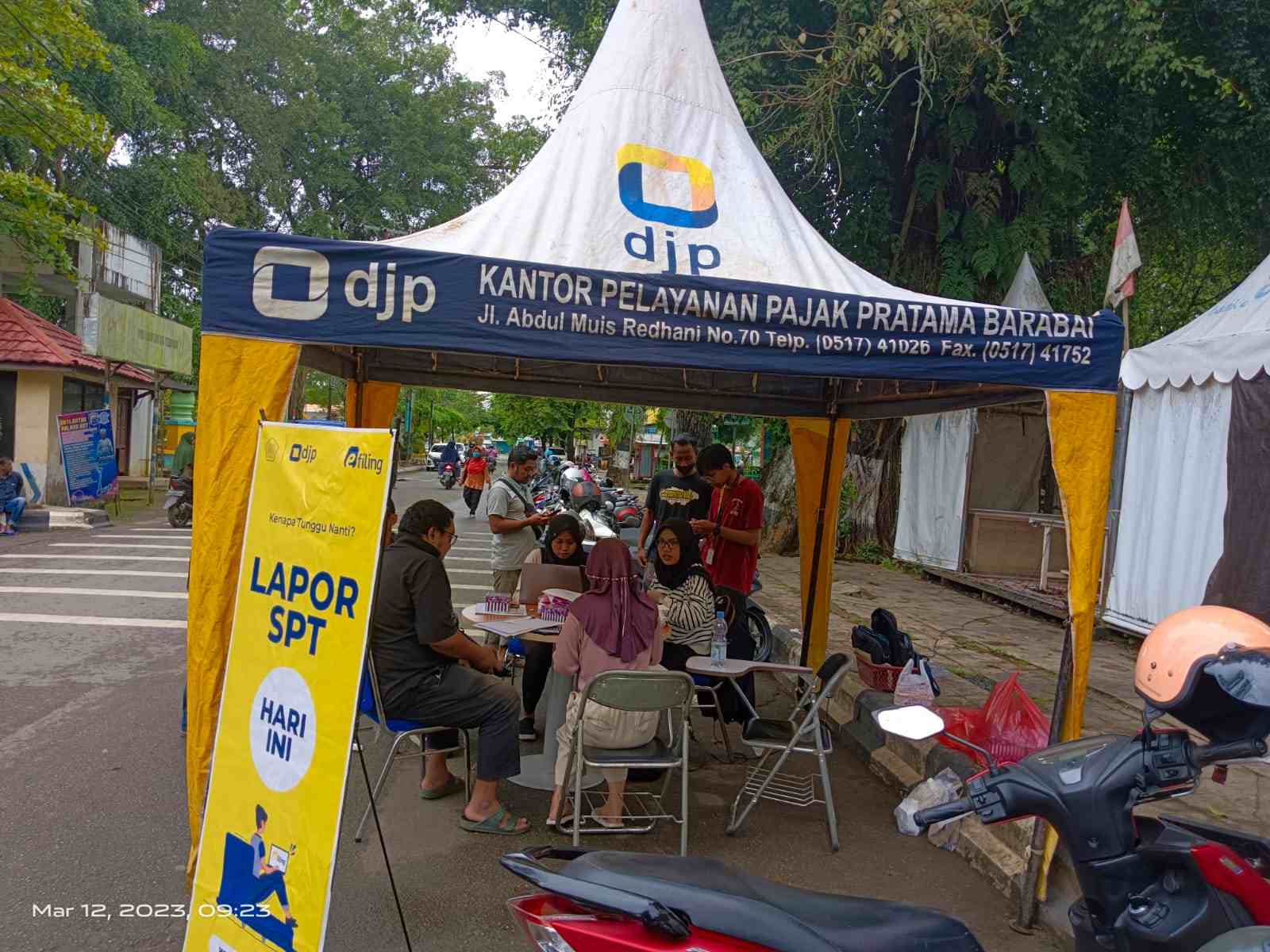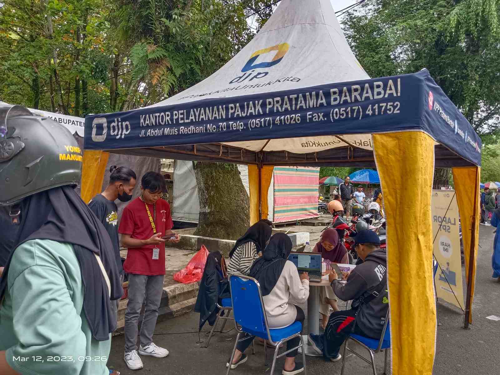 Kantor Pelayanan Pajak (KPP) Pratama Barabai membuka layanan pajak di luar kantor bertempat di Lapangan Dwiwarna Barabai, Kalimantan Selatan (Minggu, 12/3). Tujuan dari diadakannya layanan tambahan ini untuk memberikan asistensi pelaporan Surat Pemberitahuan (SPT) Tahunan 2022 kepada wajib pajak yang tidak sempat datang ke KPP Pratama Barabai.
