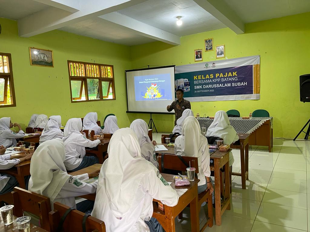 Kantor Pelayanan Pajak (KPP) Pratama Batang bersama Sekolah Menengah Kejuruan (SMK) Darussalam Subah mengadakan kelas pajak di Ruang Kelas Sekolah Menengah Kejuruan (SMK) Darussalam Subah, Batang (Selasa, 20/9).