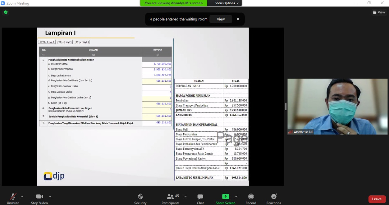 Dimulai pukul 09.00 WIB, kelas pajak dipandu oleh Tim Penyuluh Pajak Anandya Manggala Yudha dan Tri Rahayu. Account Representative Seksi Ekstensifikasi dan Penyuluhan Taryana menjadi moderator dalam kelas pajak tersebut.