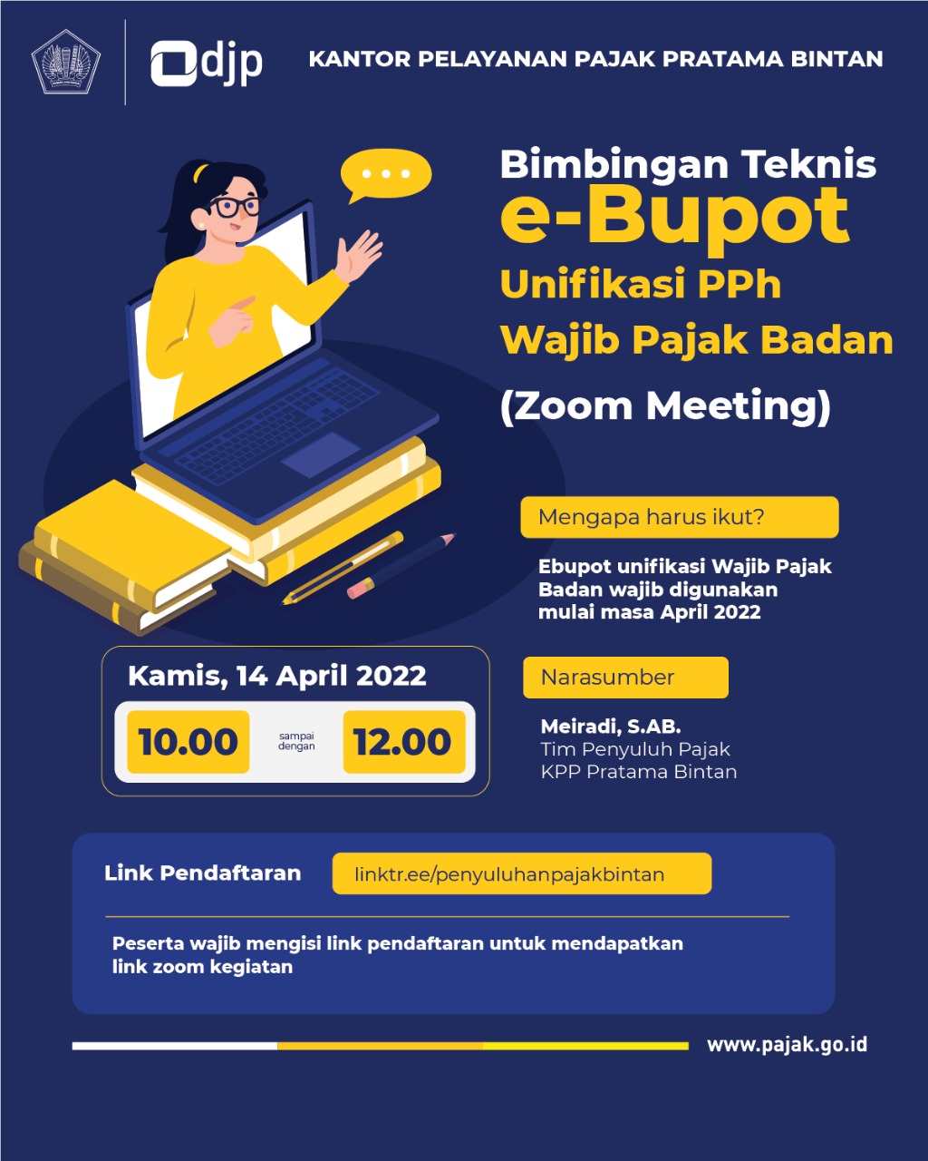 Kantor Pelayanan Pajak (KPP) Pratama Bintan menyelenggarakan bimbingan teknis (bimtek) penggunaan Aplikasi e-Bupot Unifikasi secara daring di Bintan, Kepulauan Riau (Kamis, 14/4). Bimtek ini ditujukan kepada Wajib Pajak Badan Usaha yang berminat untuk belajar aplikasi e-Bupot. Acara yang dimulai pada pukul 10.00 WIB ini berlangsung sekitar 2 jam dengan narasumber Penyuluh Pajak Meiradi. Kegiatan yang diselenggarakan secara daring ini berlangsung interaktif dengan pemaparan materi, diskusi, dan tanya jawab.