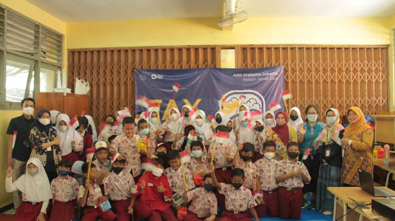 KPP Pratama Jakarta Kebon Jeruk Dua menyelenggarakan kegiatan Tax Goes To School (TGTS) di SDN Kedoya Utara 01, Jakarta Barat (Kamis, 11/8). Kegiatan tersebut melibatkan 40 peserta didik yang berasal dari perwakilan kelas 5A-5D serta beberapa guru dengan mengangkat tema “Generasi Sadar Pajak Muda Berkreasi Membangun Negeri”.