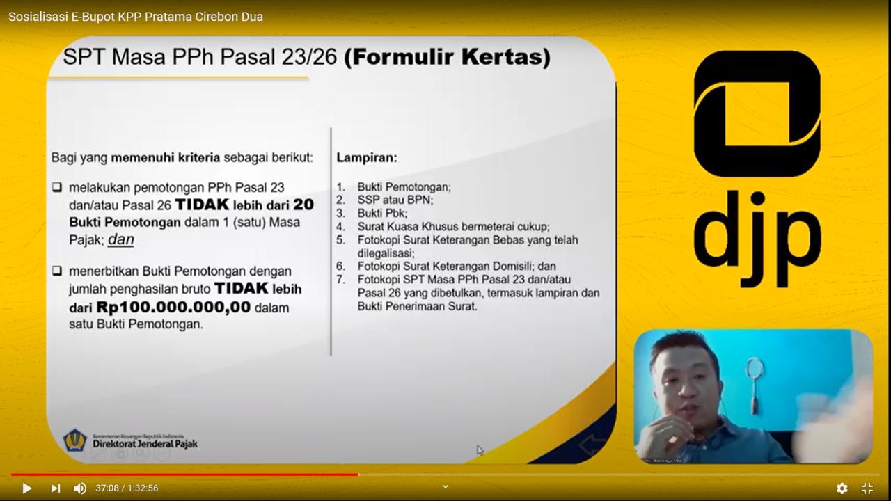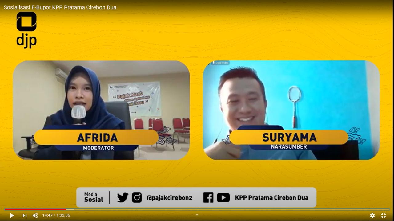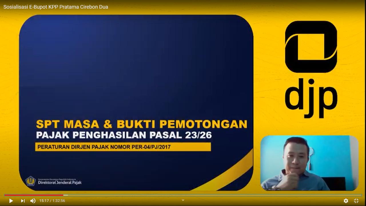 KPP Pratama Cirebon Dua menyelenggarakan Sosialisasi Perpajakan “Implementasi Nasional e-Bupot PPh 23/26 untuk seluruh PKP” dengan media Live Streaming Youtube yang dilangsungkan di Cirebon (Rabu, 5/8).