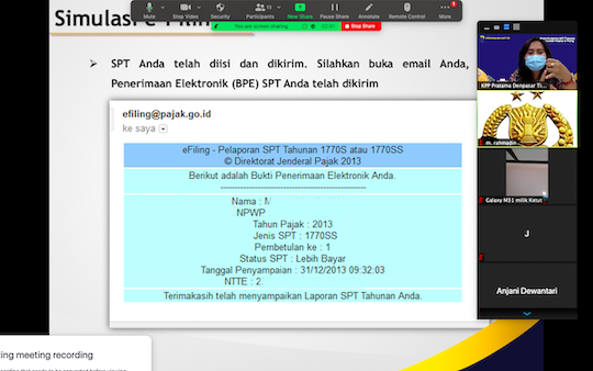 Tim Penyuluh KPP Pratama Denpasar Timur kembali menggelar Kelas Pajak Pengisian SPT Tahunan Wajib Pajak Orang Pribadi Karyawan melalui e-Filing secara daring melalui Zoom Meeting di Bali (Kamis, 11/2).