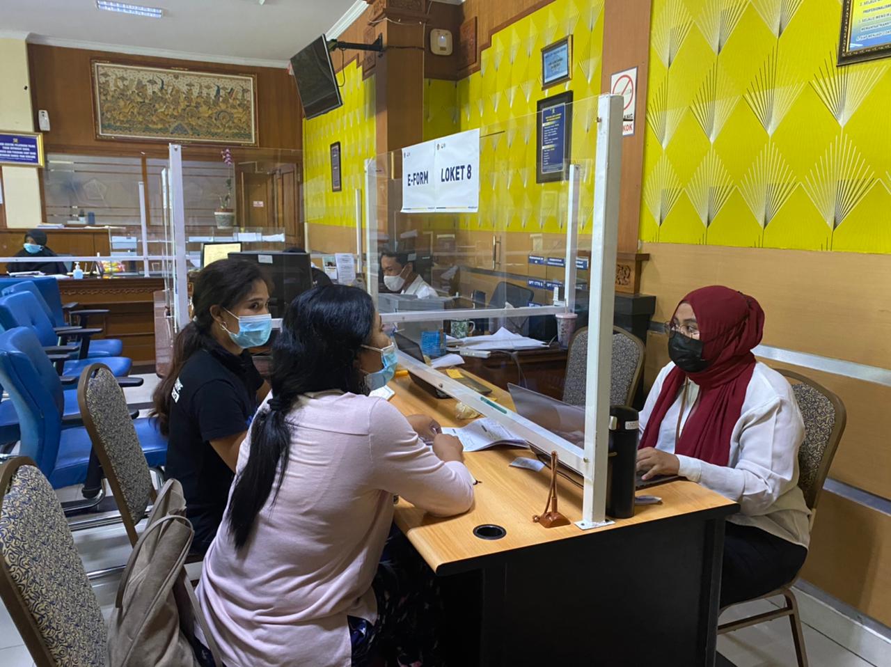 Dalam pelaksanaannya, protokol kesehatan wajib dilaksanakan oleh baik pegawai maupun wajib pajak. Terdapat partisi untuk menjaga jarak antara pegawai dan Wajib Pajak dan hand sanitizer juga disediakan di loket tersebut. \.