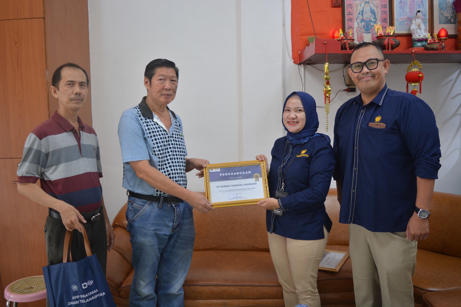 Kantor Pelayanan Pajak (KPP) Pratama Jambi Telanaipura melakukan kunjungan kerja ke PT Kurnia Tunggal Nugraha dan PT Erasakti Wiraforestama yang berlokasi di Jl. WR Supratman, Orang Kayo Hitam, Pasar Jambi, Kota Jambi (Rabu, 10/7). Kunjungan ini dilakukan untuk memberikan penghargaan kepada sejumlah wajib pajak dengan pembayaran pajak terbesar pada Tahun Pajak 2023 di wilayah kerja KPP Pratama Jambi Telanaipura.
