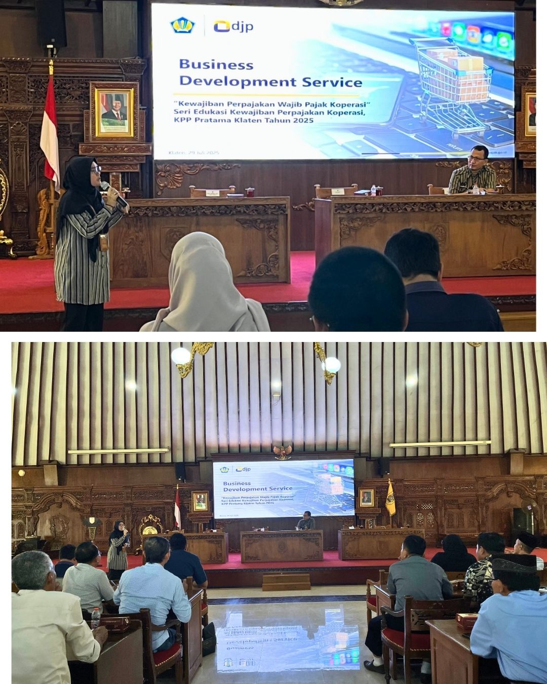 Kantor Pelayanan Pajak (KPP) Pratama Klaten memberikan edukasi perpajakan kepada para pengurus Koperasi Desa/Kelurahan Merah Putih (Kopdes Merah Putih) dalam kegiatan Kontak Bisnis Koperasi di Pendopo Kabupaten Klaten, Kabupaten Klaten (Selasa, 29/7).