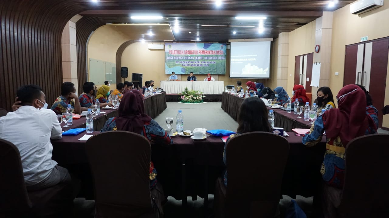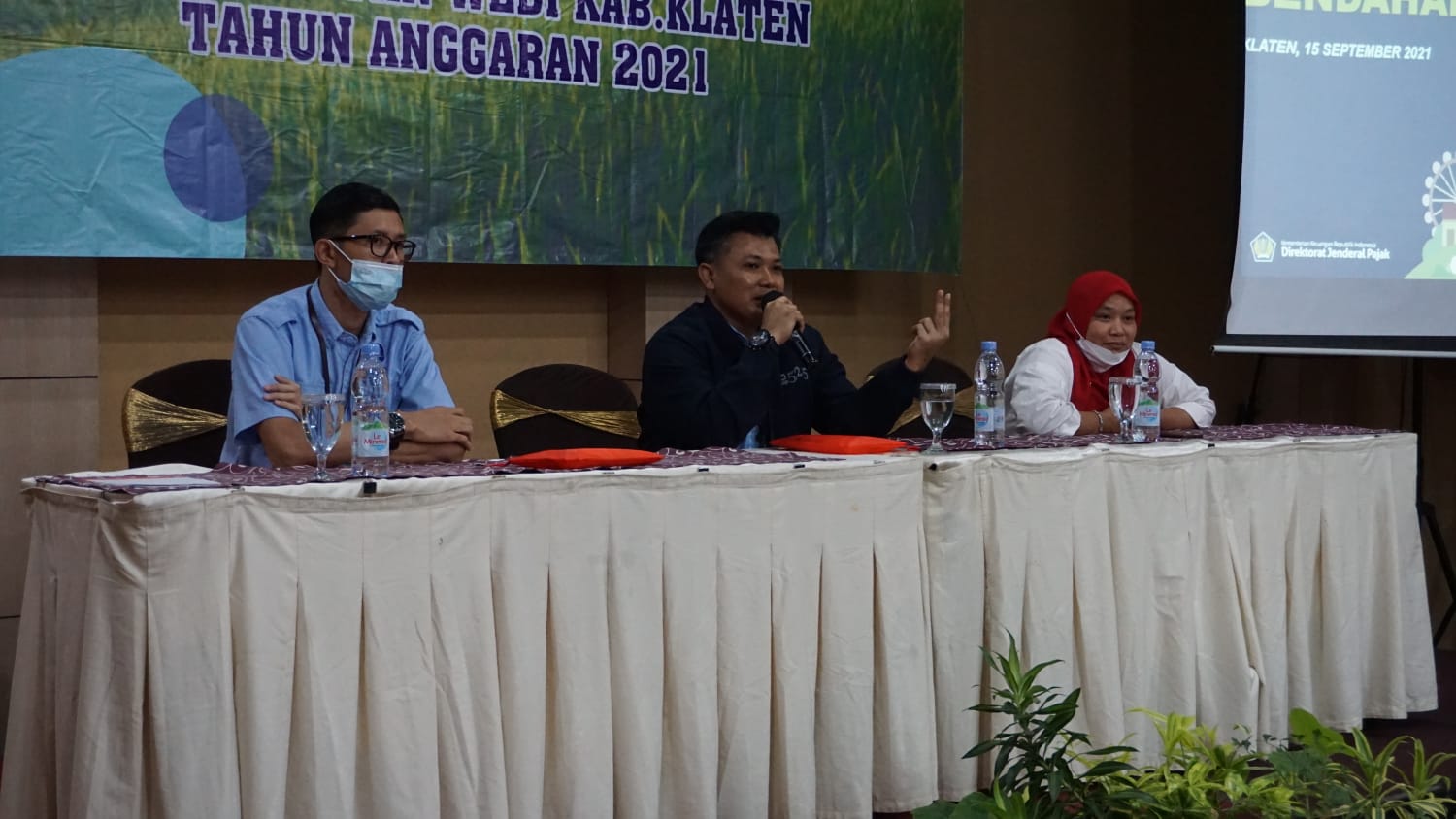 Sembilan belas bendahara desa di wilayah Kecamatan Wedi mengikuti sosialisasi perpajakan di aula Tjokro Hotel di Klaten (Rabu, 15/9). Sosialisasi dibuka dengan sambutan Budi Utomo, Kepala Seksi Pengawasan IV KPP Pratama Klaten.