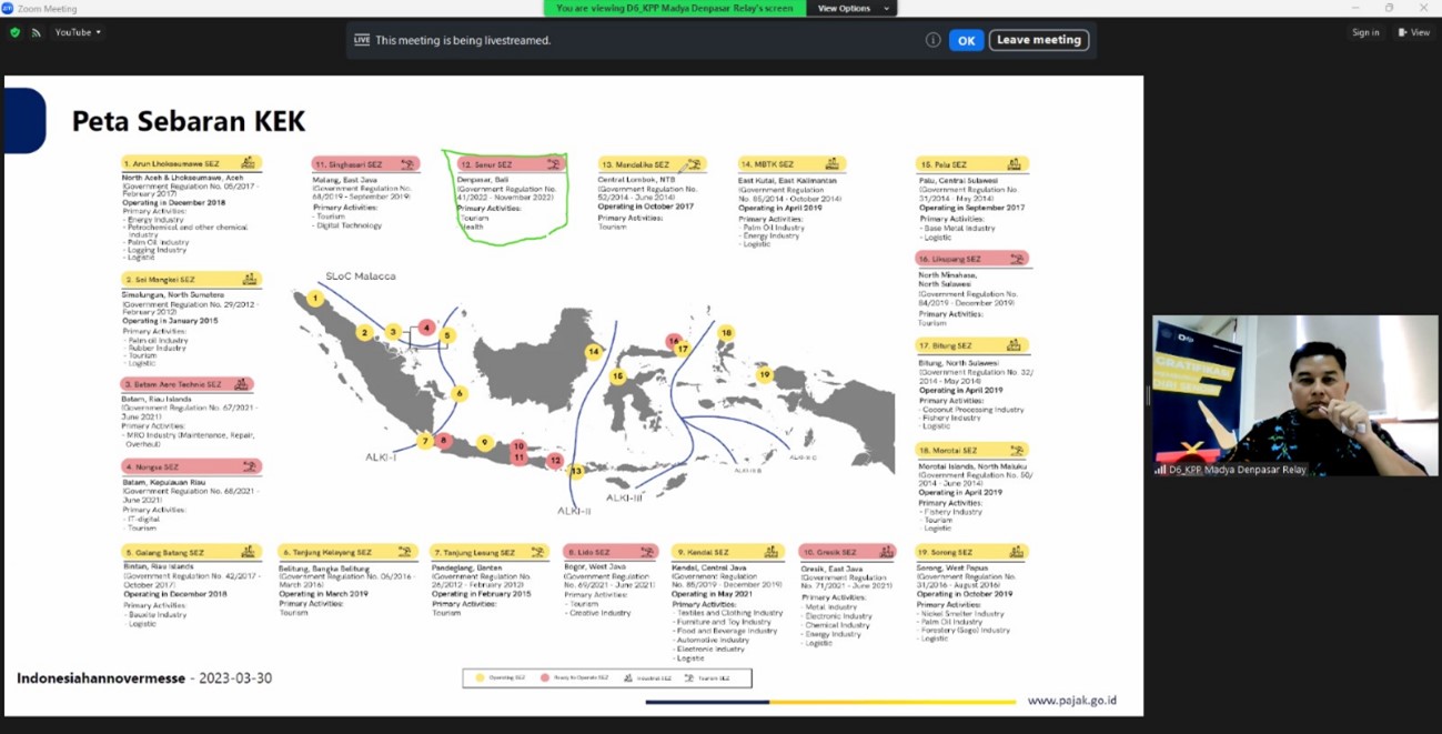 Sehubungan dengan perkembangan Kawasan Ekonomi Khusus (KEK) di Bali, Kantor Pelayanan Pajak (KPP) Madya Denpasar menugaskan sejumlah Fungsional Penyuluh Pajak untuk menjelaskan mengenai fasilitas perpajakan yang berkaitan dengan KEK. Kegiatan ini dilakukan secara daring dan dilaksanakan di ruang Seksi Pelayanan KPP Madya Denpasar (Selasa, 25/6).