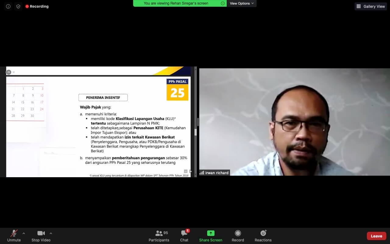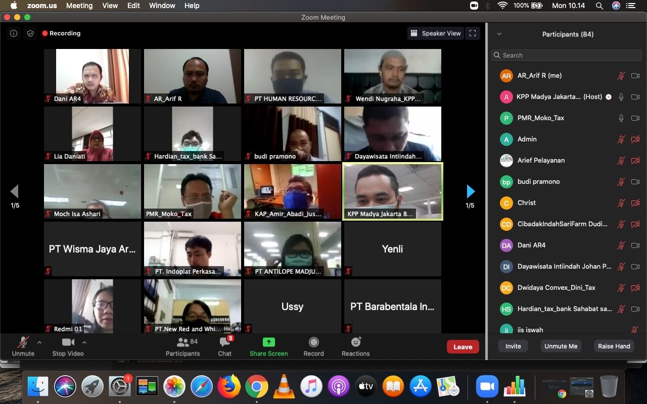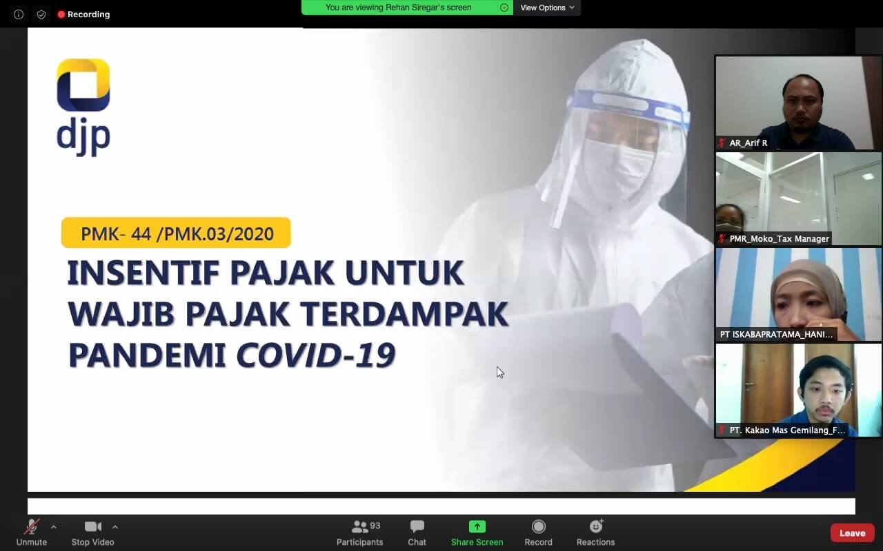 KPP Madya Jakarta Barat (Jakbar) mengadakan Kelas Pajak Daring tentang Insentif Pajak untuk Wajib Pajak Terdampak Pandemi Corona Virus Disease 2019 melalui aplikasi Zoom Clouds Meeting (Senin, 18/5). Kelas Pajak daring ini diadakan sebagai pengganti kegiatan penyuluhan secara tatap muka langsung yang masih ditiadakan untuk sementara waktu. Dalam kelas pajak ini, KPP Madya Jakarta Barat mengulas tentang PMK-44/PMK.03/2020, dengan jumlah peserta sebanyak 70 Wajib Pajak Badan yang masing-masing diwakili oleh satu orang karyawan.