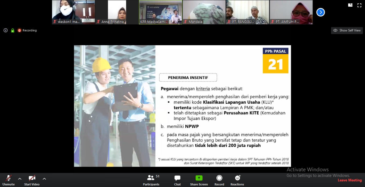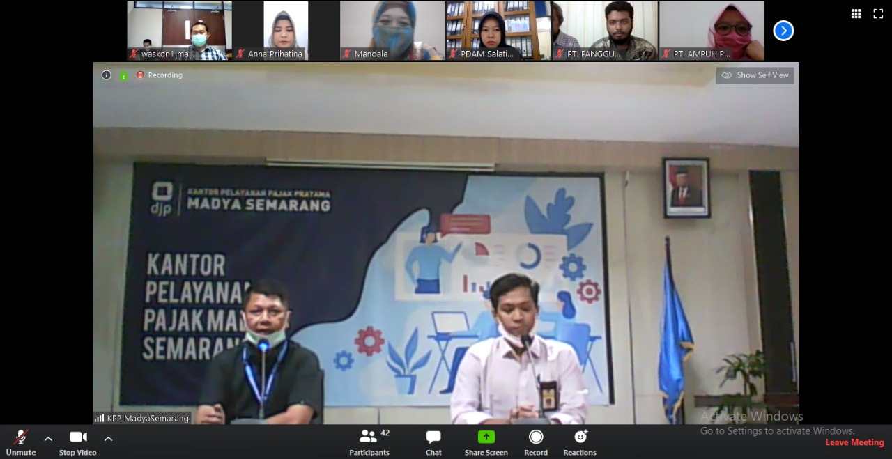 KPP Madya Semarang kembali menggelar kelas pajak yang dilakukan secara daring (online) melalui aplikasi telekonferensi Zoom Meeting (Kamis, 23/4). Mengusung tajuk Sosialisasi Insentif Pajak PMK Nomor 23 Tahun 2020, narasumber mengajak peserta untuk memanfaatkan insentif pajak yang diberikan pemerintah dalam rangka penanggulangan dampak virus Covid-19.