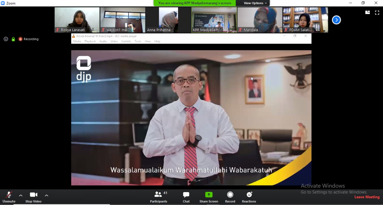 Kepala KPP Madya Semarang Nyono Laksito mengucapkan terima kasih atas kerja sama dan dukungan seluruh wajib pajak yang telah mengikuti kelas pajak daring kali ini. Nyono juga mengimbau kepada seluruh wajib pajak untuk tetap berkontribusi aktif kepada negara dengan menyampaikan SPT Tahunan tepat waktu. Ia menambahkan bahwa KPP Madya Semarang berusaha terus memberikan pelayanan yang terbaik kepada seluruh wajib pajak melalui lini daring yang telah disediakan.