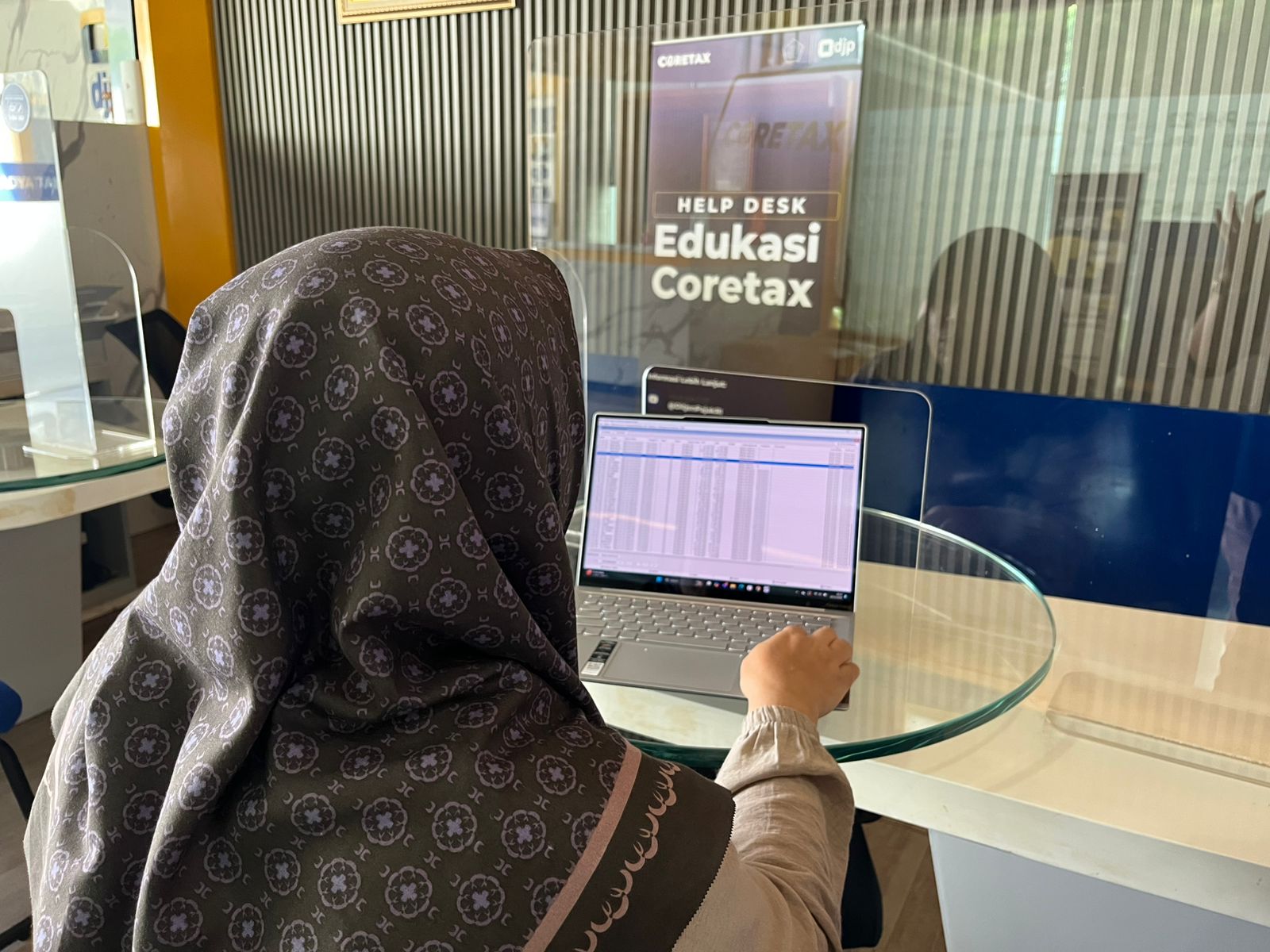 Hamidah, Penyuluh Kantor Pelayanan Pajak (KPP) Madya Tangerang, memberikan asistensi kepada wajib pajak terkait penggunaan aplikasi e-Faktur di Ruang Helpdesk Tempat Pelayanan Terpadu (TPT) KPP Madya Tangerang, Pinang, Kota Tangerang, Banten (Rabu, 18/12).
