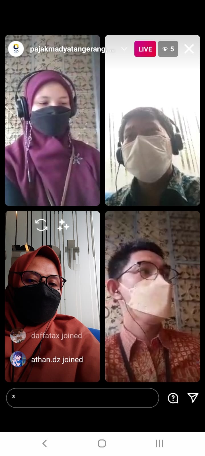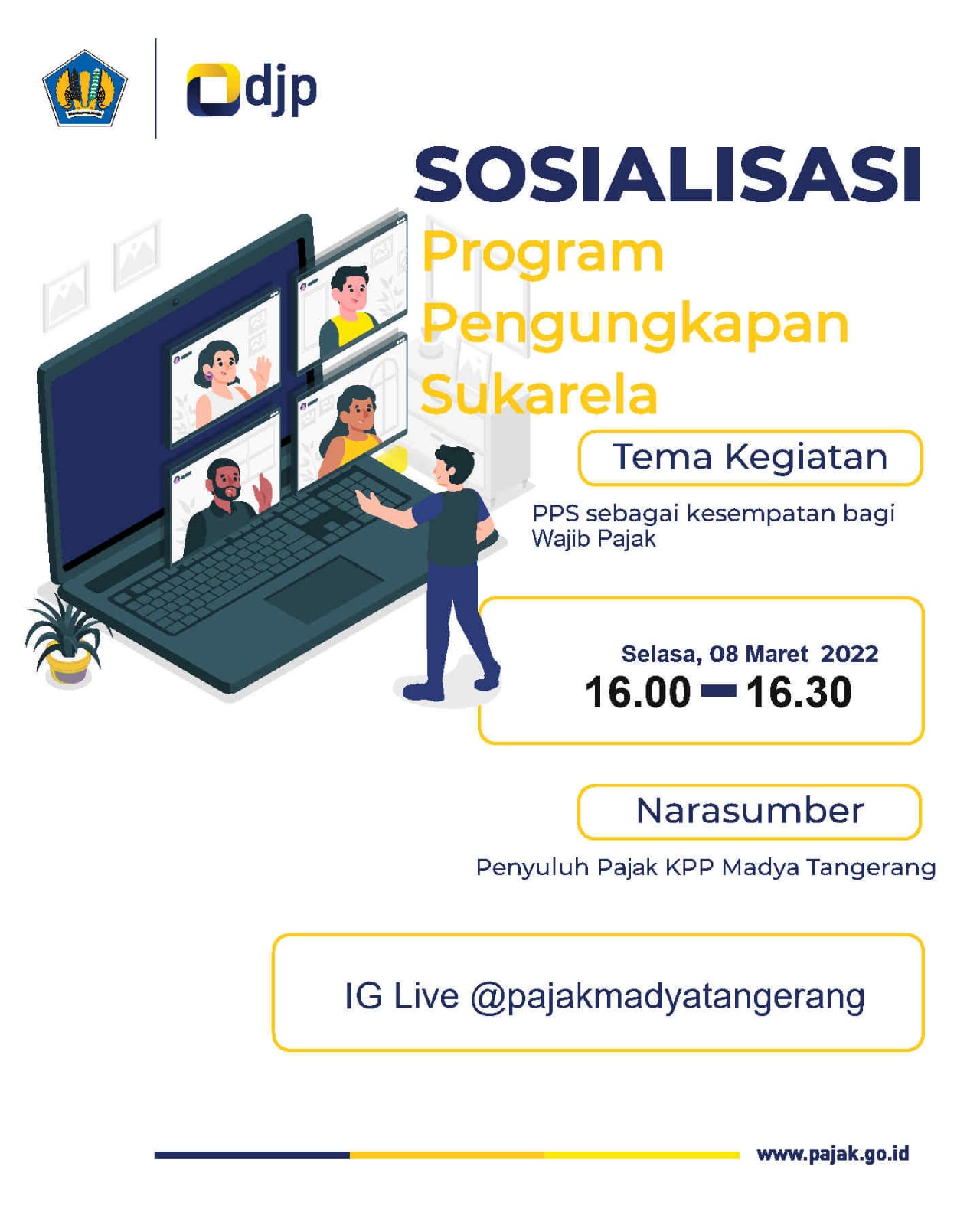 Kantor Pelayanan Pajak (KPP) Madya Tangerang menyelenggarakan kelas pajak daring tentang Sosialisasi Program Pengungkapan Sukarela dengan tema PPS sebagai kesempatan bagi Wajib Pajak dengan memanfaatkan fitur live Instagram langsung dari KPP Madya Tangerang, Kota Tangerang (Selasa, 08/03).