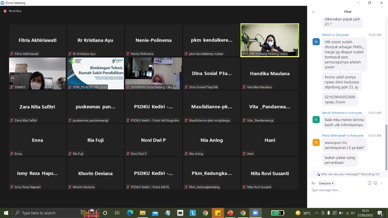 Nara sumber kelas pajak kali ini adalah Asisten Penyuluh Pajak Terampil KPP Pratama Malang Utara, Kristiana Ayu yang memberikan materi Peraturan Menteri Keuangan (PMK) Nomor 59/PMK.03/2022. Peserta mengikuti kelas pajak dengan antusias. Hal ini terlihat dari banyaknya pertanyaan yang disampaikan oleh para bendahara instansi pemerintah di akhir acara. Materi perpajakan ini sangat diperlukan oleh para bendahara instansi pemerintah mengingat peraturan dalam PMK tersebut berlaku sejak 1 Mei 2022.