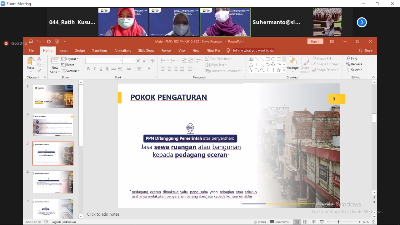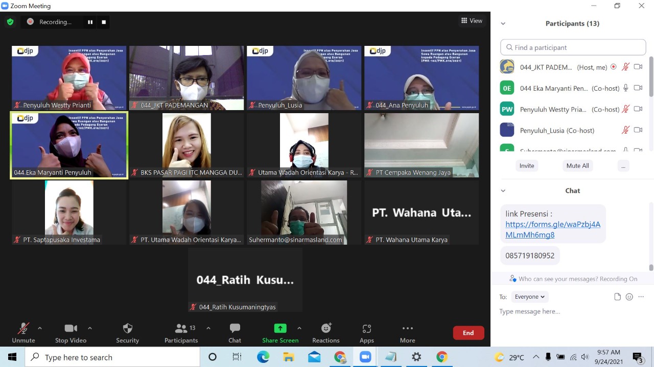 Kantor Pelayanan Pajak Pratama Jakarta Pademangan mengadakan kelas pajak terkait PMK-102/PMK.010/2021 di ruang penyuluhan KPP Pademangan (Jumat, 24/9). Kegiatan diselenggarakan melalui kanal Zoom Meeting. Materi kelas pajak disampaikan Tim Penyuluh Pajak KPP Pratama Jakarta Pademangan