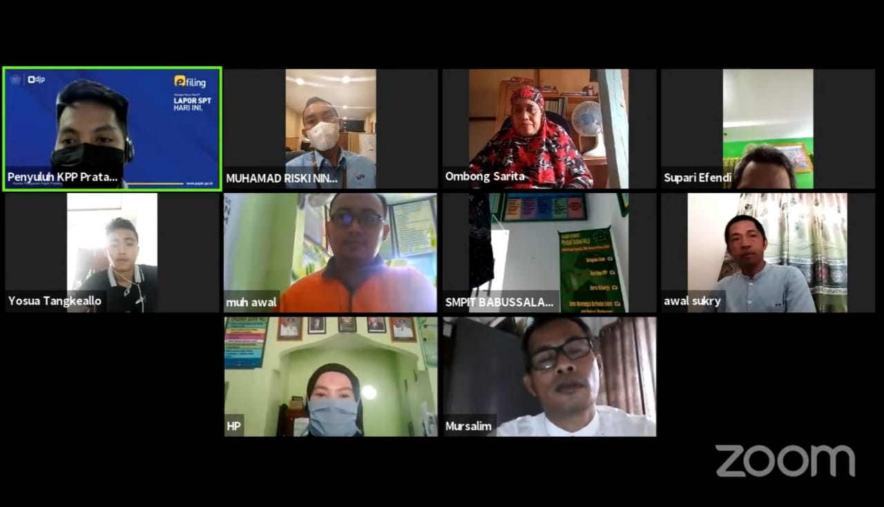Kantor Pelayanan Pajak (KPP) Pratama Palopo mengadakan kegiatan edukasi pajak berupa Kelas Pajak bagi Wajib Pajak Badan (Rabu, 28/4). Kegiatan ini dilaksanakan secara daring melalui aplikasi Zoom Meeting di ruang aula KPP Pratama Palopo, Kota Palopo.