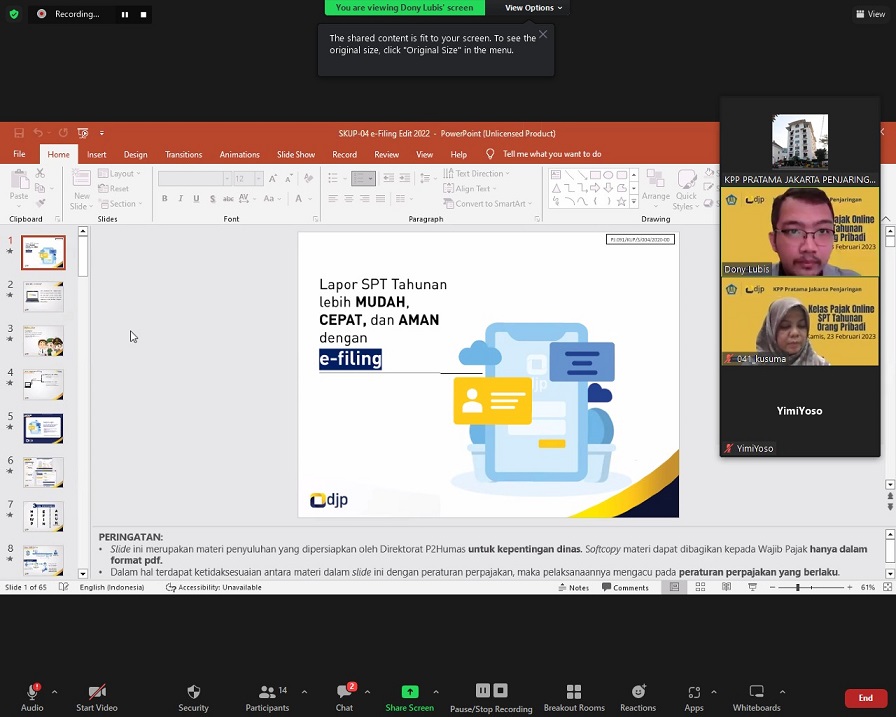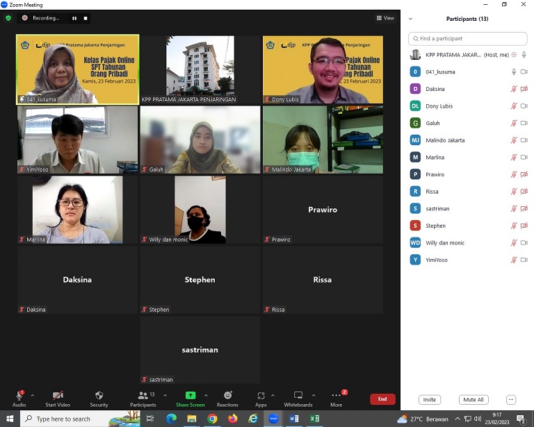 Kantor Pelayanan Pajak (KPP) Pratama Jakarta Penjaringan adakan kelas pajak tentang pelaporan SPT Tahunan PPh Orang Pribadi. Kelas pajak diikuti oleh 12 peserta dan diadakan secara daring di Jakarta (Kamis, 23/2).