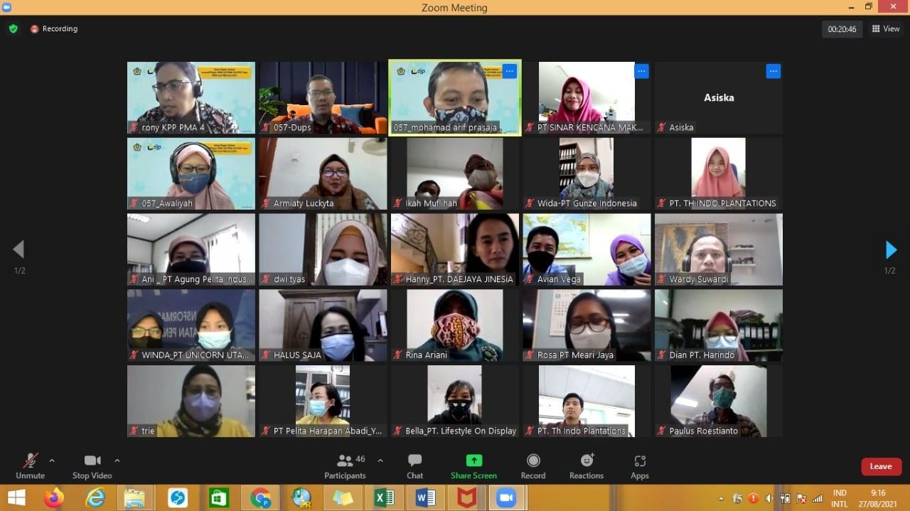 Tim Fungsional Penyuluh KPP Penanaman Modal Asing Empat (PMA 4) mengadakan Kelas Pajak mengenai Insentif Pajak untuk Wajib Pajak terdapak Pandemi Covid-19 secara daring di Jakarta (Jumat, 27/8).