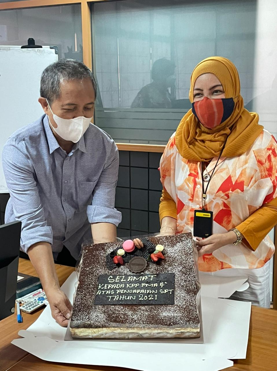 Melalui Kepala Bidang Penyuluhan Pelayanan dan Hubungan Masyarakat Kanwil DJP Jakarta Khusus Henny Suarti Suardi datang ke KPP PMA Empat untuk memberikan penghargaan secara langsung. KPP PMA Empat berhasil meraih target kepatuhan sebesar 100,19%. Dari 530 Wajib Pajak yang ditargetkan, pada 29 Agustus 2021 lalu KPP PMA Empat mencapai 531 Wajib Pajak yang melaporkan SPT Tahunannya.