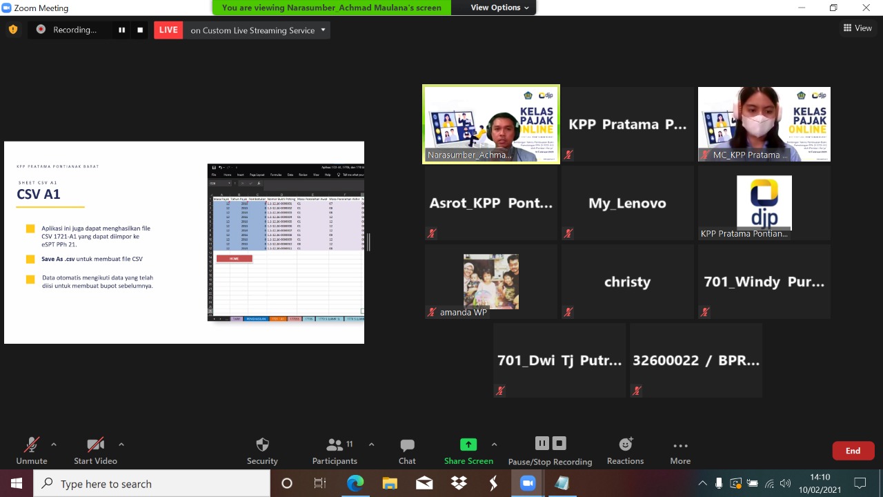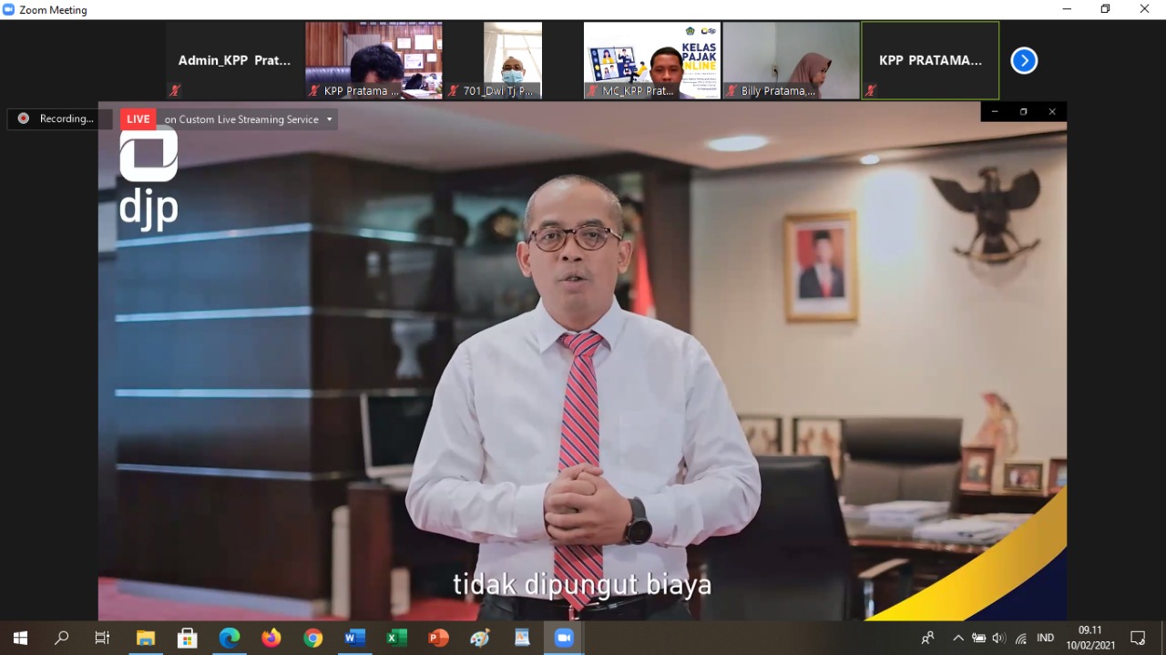 Kantor Pelayanan Pajak (KPP) Pratama Pontianak Barat mengadakan Kelas Pajak Pembuatan Bukti Pemotongan PPh Pasal 21 (Formulir 1721-A1) bagi Pemberi Kerja secara daring di ruang multimedia KPP Pratama Pontianak Barat (Rabu, 10/2).