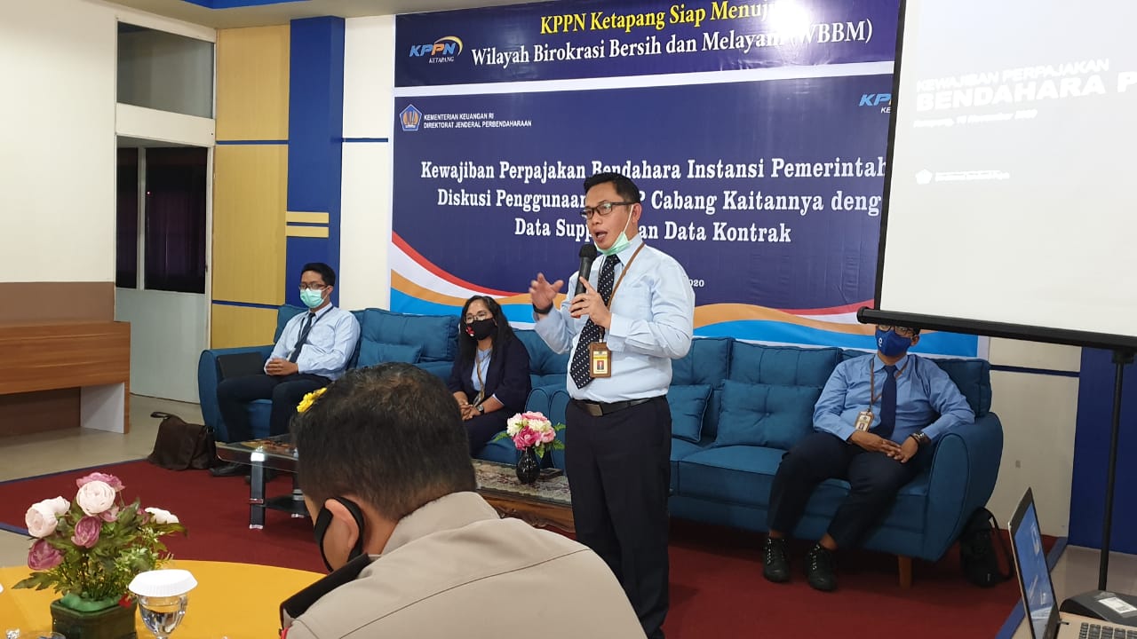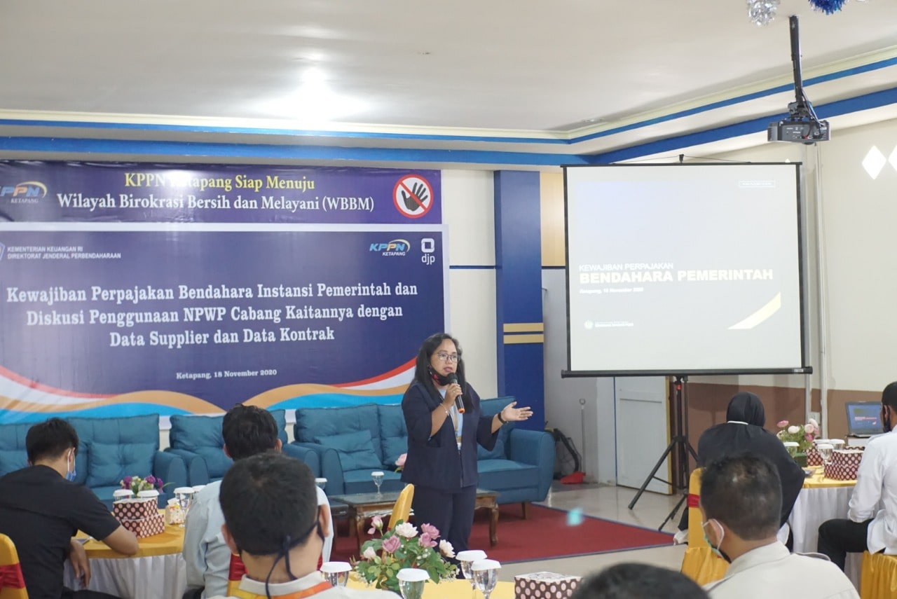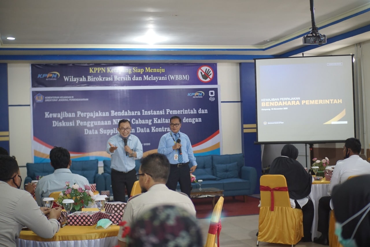Kantor Pelayanan Pajak (KPP) Pratama Ketapang menjadi narasumber pada kegiatan "Sosialisasi Kewajiban Perpajakan Bendahara Instansi Pemerintah dan Diskusi Penggunaan NPWP Cabang Kaitannya dengan Data Supplier dan Data Kontrak" yang diadakan oleh Kantor Pelayanan Perbendaharaan Negara (KPPN) Tipe A2 Ketapang di Aula KPPN Ketapang (Rabu, 18/11).