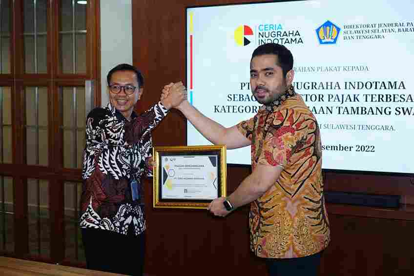 Penghargaan diberikan kepada PT Ceria Nugraha Indotama atas kontribusi penerimaan pajak terbesar kategori perusahaan pertambangan swasta. Penghargaan ini diberikan oleh Kepala KPP Pratama Kolaka Jarod Sri Raharjo didampingi Taufik Harris Edyna dan Sugiarto sebagai kepala seksi dan Account Representative (AR) yang menangani wajib pajak tersebut.