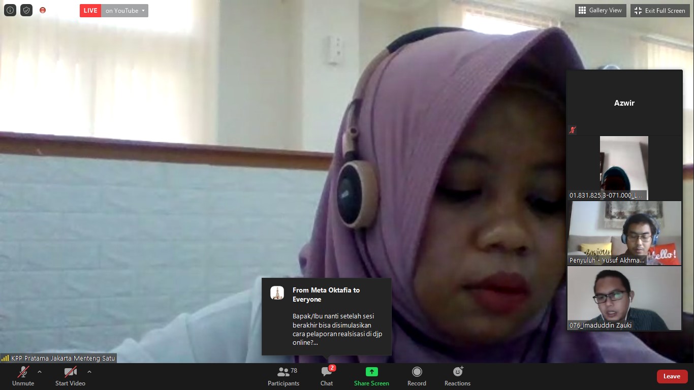 KPP Pratama Jakarta Menteng Satu, KPP Pratama Jakarta Menteng Dua, dan KPP Pratama Jakarta Menteng Tiga secara bersama-sama mengadakan Sosialisasi Insentif Pajak melalui Kelas Pajak Online (Kamis, 18/5). Kegiatan yang diikuti oleh beberapa wajib pajak tersebut membahas Peraturan Menteri Keuangan Nomor : PMK-44/PMK.03/2020 yang mengatur Insentif Pajak Jilid II Sebagai Dampak Covid-19.