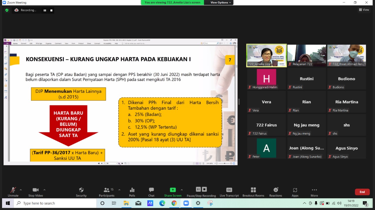 Kantor Pelayanan Pajak (KPP) Pratama Samarinda Ilir mengadakan Kelas Pajak Program Pengungkapan Sukarela secara secara online melalui Zoom Meeting di Samarinda (Rabu, 19 /01).