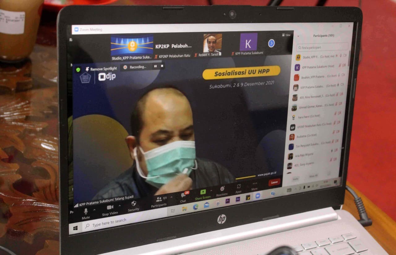 Kantor Pelayanan Pajak (KPP) Pratama Sukabumi kembali menyelenggarakan Kelas Pajak dengan topik Sosialisasi Undang-Undang Harmonisasi Peraturan Perpajakan (UU HPP) kepada lebih dari 100 wajib pajak secara daring melalui media Zoom Meeting di Kota Sukabumi (Kamis, 2/12).