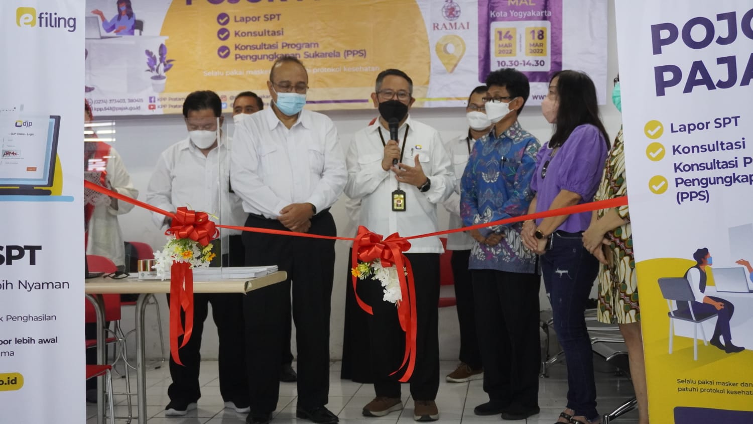 Kepala Kantor Wilayah Direktorat Jenderal Pajak Daerah Istimewa Yogyakarta (Kanwil DJP DIY) Yoyok Satiotomo bersama Kepala Kantor Pelayanan Pajak (KPP) Pratama Yogyakarta Andi Setiawan meresmikan kegiatan pojok pajak yang diselenggarakan oleh KPP Pratama Yogyakarta di Mal Ramai Yogyakarta (Senin, 14/3). Pembukaan pojok pajak ini juga disaksikan oleh pemilik Mal Ramai Yogyakarta.