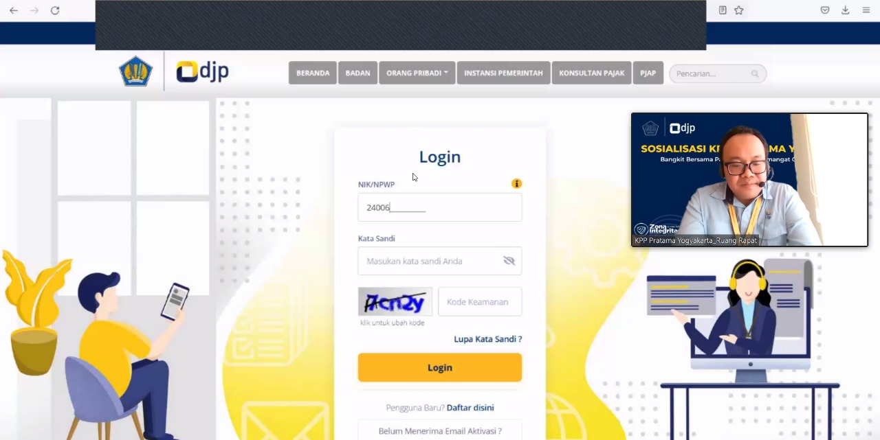 Sebagai strategi penyuksesan implementasi NIK sebagai NPWP, KPP Pratama Yogyakarta kembali menggelar sosialisasi daring bertajuk Pemutakhiran Data Mandiri dalam rangka Implementasi NIK menjadi NPWP Orang Pribadi (Rabu, 11/01).