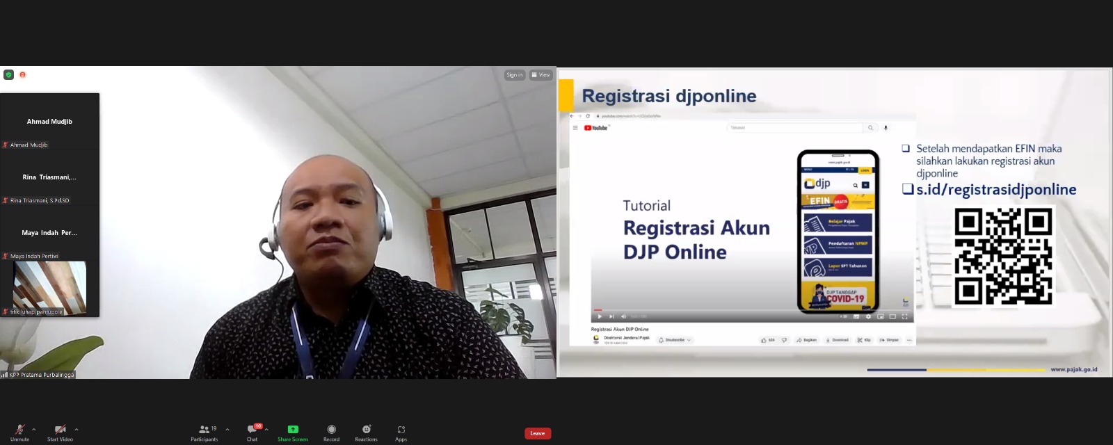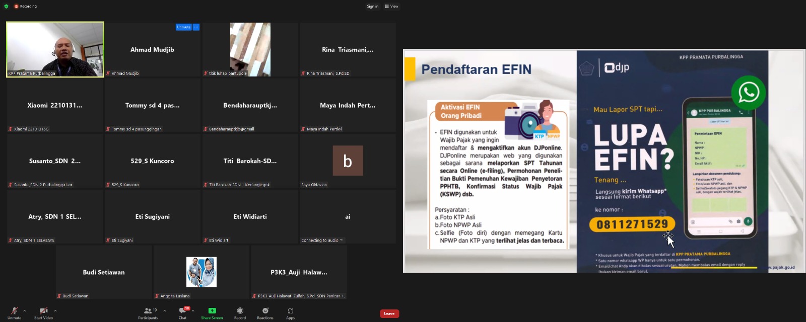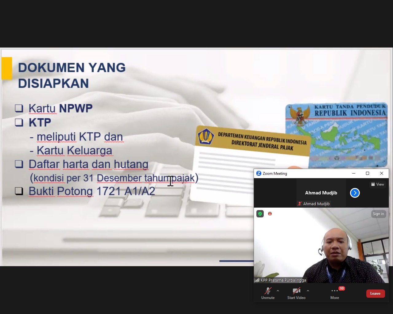 Kantor Pelayanan Pajak (KPP) Pratama Purbalingga mengadakan Sosialisasi Pengisian dan Pelaporan SPT Tahunan PPh Orang Pribadi. Kegiatan ini dilaksanakan di secara daring melalui Zoom Cloud Meeting di Ruang Multimedia KPP Pratama Purbalingga, Purbalingga (Kamis, 22/6). Kegiatan ini merupakan kegiatan lanjutan dari rangkaian edukasi perpajakan kepada ASN yang ada di lingkungan pemerintah Kabupaten Purbalingga.