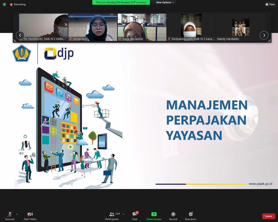 Universitas Islam Negeri (UIN) Walisongo Semarang mengundang Fungsional Penyuluh Pajak KPP Pratama Semarang Barat untuk menjadi narasumber di webinar tax center “Kupas Tuntas Pelaporan Keuangan dan Pajak Yayasan” yang dilakanakan secara daring di Semarang (Kamis, 11/11). Webinar tax center diikuti oleh 160 peserta yang terdiri dari anggota tax center, mahasiswa UIN Walisongo Semarang, dan wajib pajak yayasan lainnya.