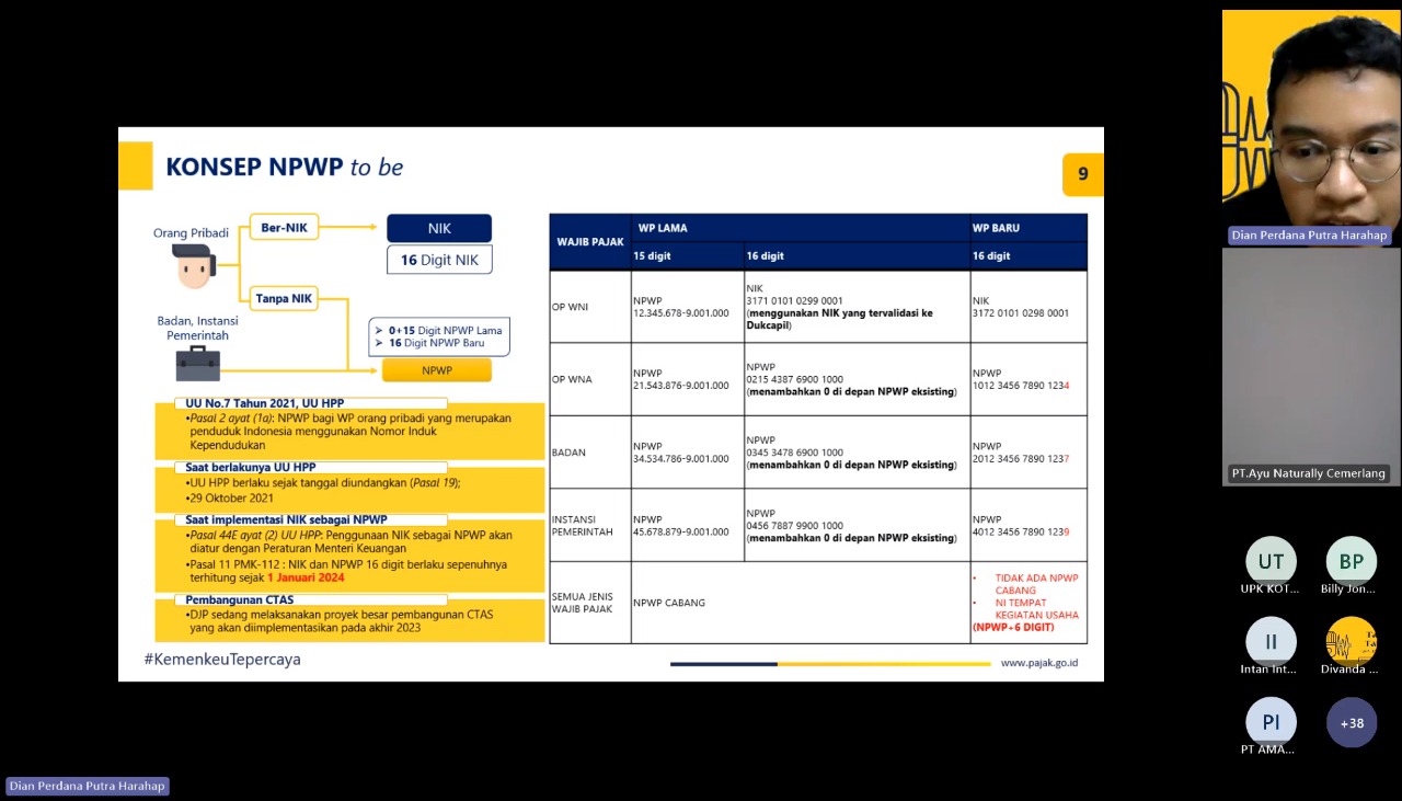 Kegiatan ini diikuti oleh Wajib Pajak Badan selaku pemberi kerja yang melaksanakan kewajiban pemotongan dan pelaporan PPh Pasal 21. Materi kelas pajak disampaikan oleh Fungsional Penyuluh Pajak KPP Pratama Jakarta Tamansari Dian Perdana Putra Harahap. Dian menjelaskan dua pokok bahasan yaitu tentang tata cara layanan pemadanan NIK-NPWP dan penyesuaian sistem terdampak NPWP.