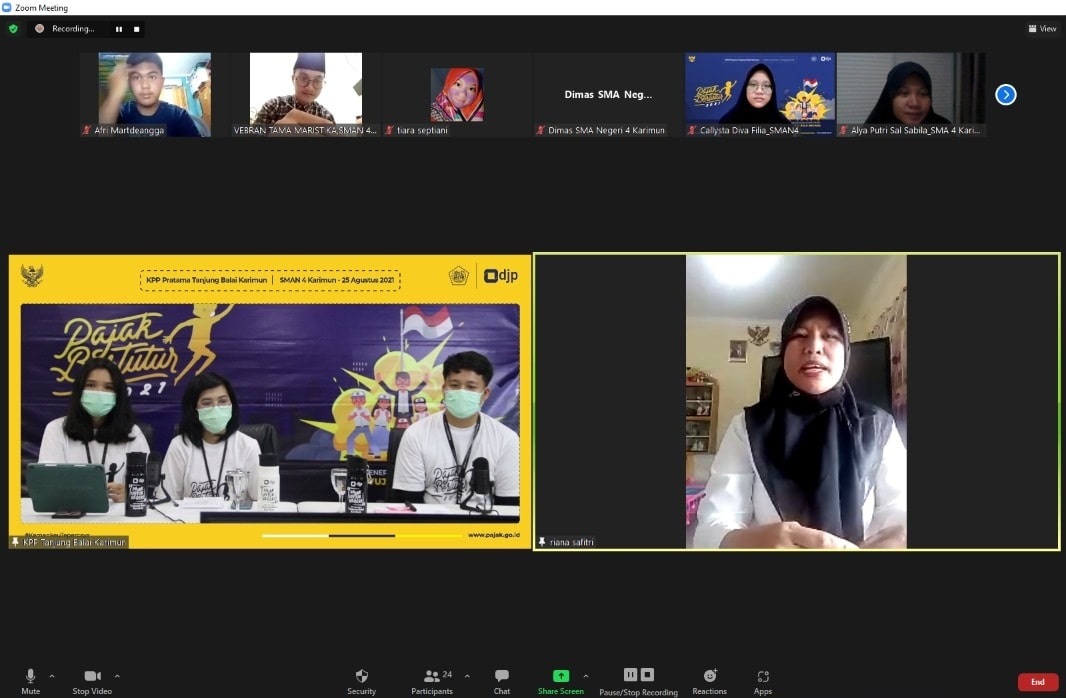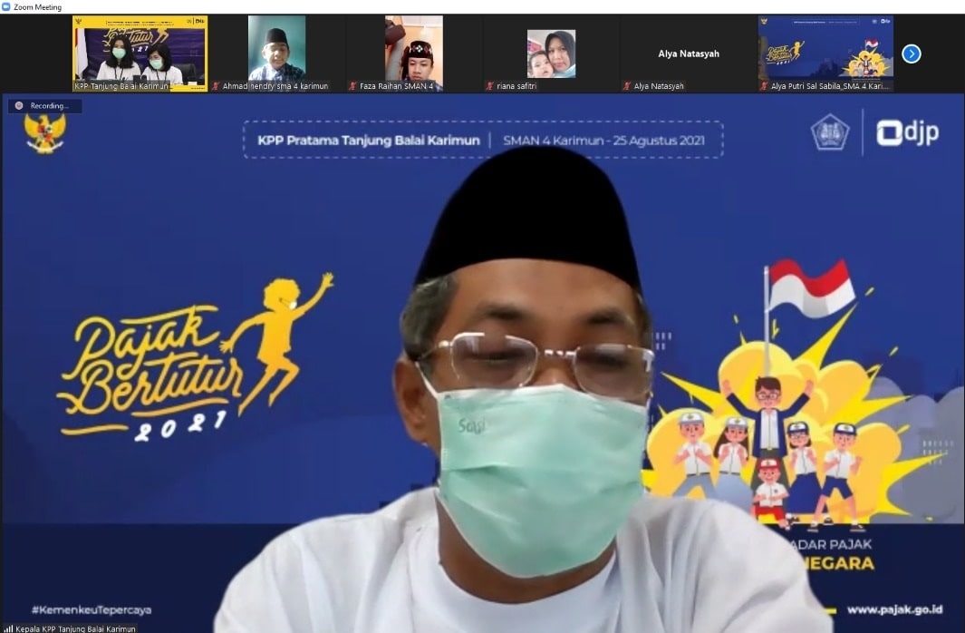 Kantor Pelayanan Pajak (KPP) Pratama Tanjung Balai Karimun (TBK) melaksanakan Pajak Bertutur 2021 secara daring dengan tema “Generasi Muda Sadar Pajak, Wujud Bela Negara” yang diikuti oleh siswa-siswi SMAN 4 Karimun di kabupaten Karimun, Kepulauan Riau (Rabu, 25/8). Kegiatan ini diselenggarakan secara serentak oleh seluruh unit vertikal Direktorat Jenderal Pajak.