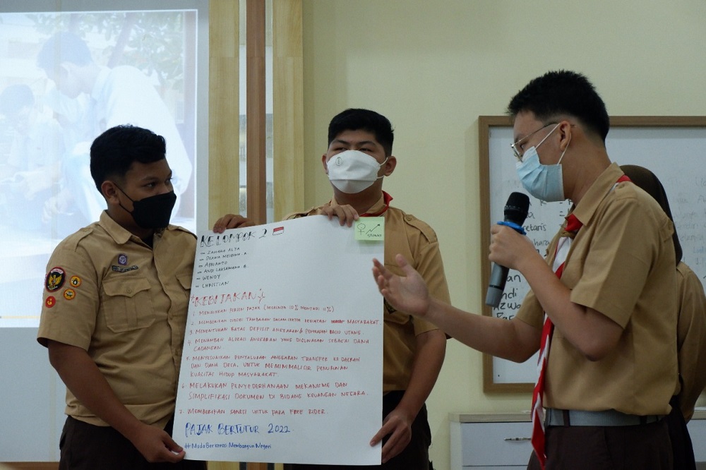 Selain mendapatkan materi tentang pajak, para peserta diajak mendalami peran dengan berdiskusi secara kelompok tentang hal apa saja yang akan mereka lakukan jika kelak menjadi Menteri Keuangan Republik Indonesia.