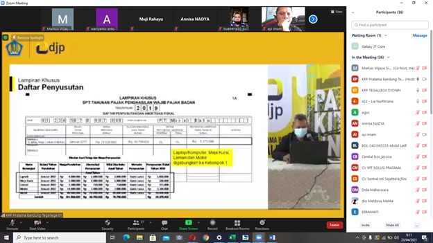 Kantor Pelayanan Pajak (KPP) Pratama Bandung Tegallega menyelenggarakan kelas pajak pengisian SPT Tahunan PPh bagi Wajib Pajak Badan secara daring melalui aplikasi Zoom Meeting di Bandung (Jumat, 23/4).