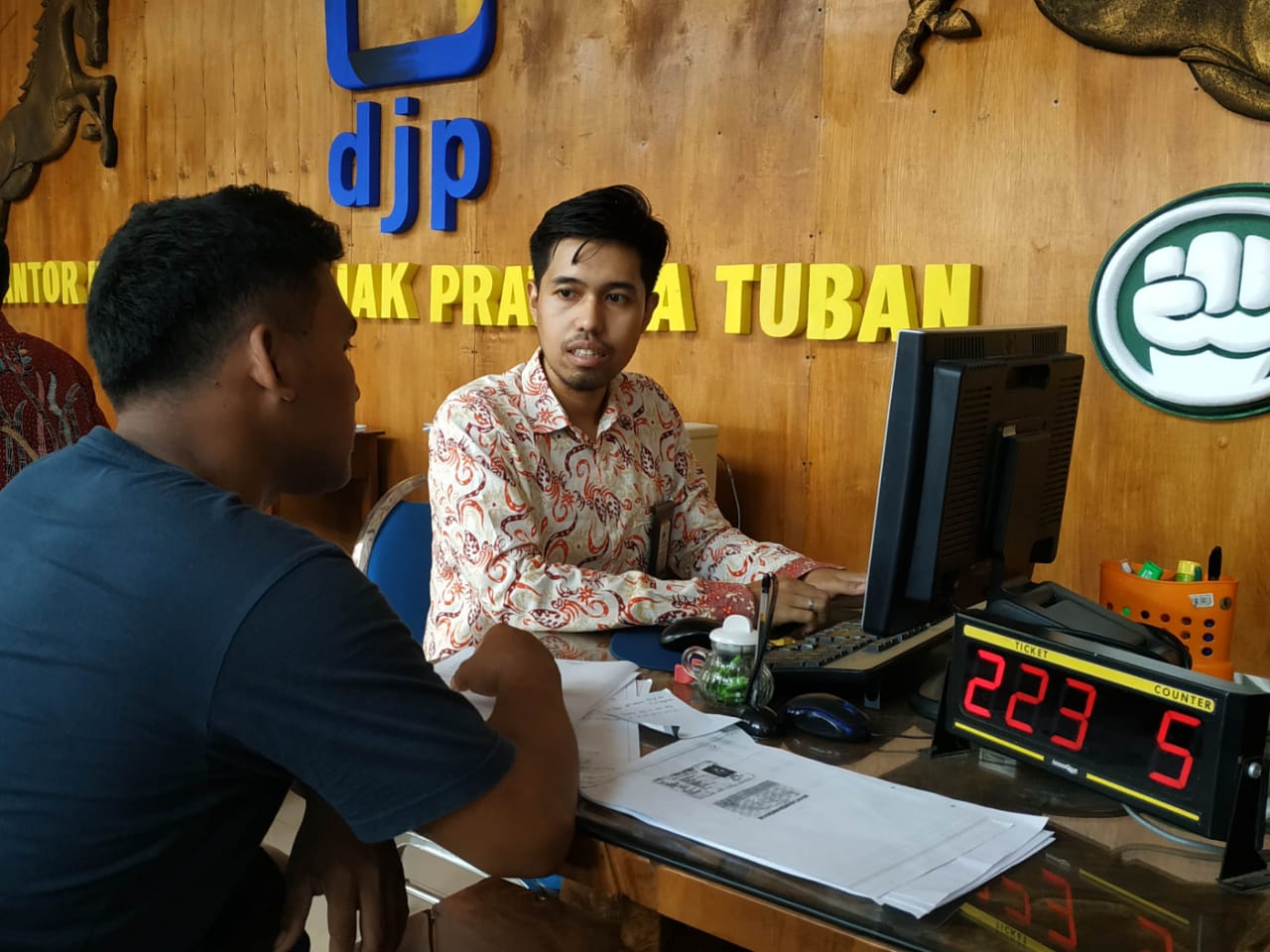 Petugas frontliner KPP Pratama Tuban kembali memberi informasi kepada wajib pajak terkait peranan Kantor Pos cabang KPP Pratama Tuban (Selasa 16/10). Kerja sama antara KPP Pratama Tuban dan Kantor Pos Tuban menjadi salah satu upaya membangun sinergi untuk mengoptimalkan pelayanan terhadap wajib pajak. Sinergi ini memberikan kemudahan bagi wajib pajak dalam memenuhi kewajiban perpajakannya.