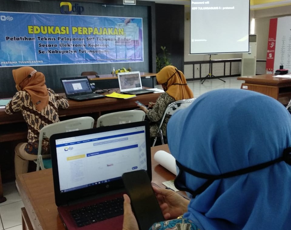 Kantor Pelayanan Pajak (KPP) Pratama Tulungagung menyelenggarakan kegiatan edukasi kewajiban perpajakan serta asistensi pengisian SPT Tahunan Badan bagi pengurus Koperasi Wanita se-Kabupaten Tulungagung (Senin, 26/4). Kegiatan ini dilangsungkan secara tatap muka di ruang aula lantai tiga KPP Pratama Tulungagung, Kabupaten Tulungagung dengan tetap mematuhi protokol kesehatan guna mencegah penyebaran virus Covid-19.